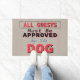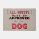 La famille et les amis vont se faire rire en lisant ce tapis de porte drôle et humoristique. Moderne Bienvenue clients avec un message clair : Tous Les Clients Doivent Être Approuvés Par Le Chien. Style de typographie moderne noir, rouge, blanc et bleu style cotation amusante. Arrière - plan texturé Brown.