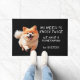 "Pas besoin de frapper deux fois, Nous avons un Poméranien" déclare ce drôle de tapis de porte. Le texte est en blanc à droite, tandis qu'une image d'un adorable Poméranien orange est à gauche. Tout est placé sur un arrière - plan noir.