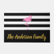 Faites savoir à vos visiteurs qu'ils sont arrivés chez eux. Vous pouvez ajouter le nom de votre famille en faux script d'or sur la large bande noire en bas. Le arrière - plan est à rayures blanches et noires. Un flamant rose est au-dessus du texte.