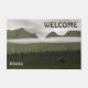 Un tableau numérique "primitif" ou de style folklorique de conifères verts et de montagnes en Alaska par une journée très grise et nuageuse. Un orignal (Alces alces) au premier plan donne de l'échelle à la scène. Il y a deux cas de lecture de texte personnalisable, "Alaska" et "WELCOME".