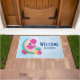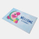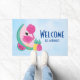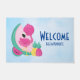 Un tapis de bienvenue avec votre nom personnalisé. Illustration aiguë d'un flamant rose avec quelques pastèques et ananas. Couleurs rose et vert. L'été et tropical. L'arrière - plan est une aquarelle bleu clair.