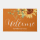 Ce matelas à plateau-coussin avec literie de qualité supérieure vous garantit une bonne nuit de sommeil. L'arrière - plan est une élégante couleur orange brûlée avec des tournesols couleur or. Un délicat bouquet sauvage est représenté en haut, avec le message d'accueil et le nom de famille imprimé ci-dessous.