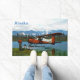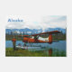 Un pilote de brousse se tient près de son hydravion DHC-2 Beaver de Havilland Canada sur la rive d'un lac à l'extrême nord; les montagnes et les arbres sont au loin. Le texte personnalisable "Alaska" apparaît également. Cette image provient, en partie, d'une photo du US Fish and Wildlife Service.