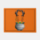 Le mat de porte d'Halloween est montré avec une sorcière dans un pot bouillonnant imprimé sur une couleur arrière - plan orange. Customisez ce tapis ou achetez tel quel.