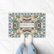 Un élégant matelas de porte avec votre plaque d'immatriculation sur un beau motif de formes géométriques fleuris en vert, crème, bronzé, bleu. Un personnage accrocheur rempli porte d'entrée fleurie rappelant les carreaux de mosaïque ancienne.