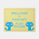 Bienvenue à Playhouse doormat avec nom(s) personnalisé(s) et illustrations de chat amusant pour la maison de jeux pour enfants. Deux visages de chat souriants en bleu et rose. Customisez le nom et changez de couleur arrière - plan si vous le souhaitez. Superbe décor de maison de jeux pour les jeunes enfants qui aiment les chats.