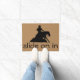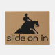 Ce paillasson intelligent appartient à la ferme de maîtrise de cheval à coup sûr. Il comporte une image de silhouette de clipart (images graphiques) d'un cowboy montant un cheval de maîtrise venant à un arrêt coulissant. Les mots sur le tapis lu "glissent dessus dans".