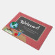 Ce tapis de bienvenue de classe présente une illustration d'un bureau d'enseignant agrémenté d'un globe terrestre, de livres, de pommes et de crayons. Le tableau de bord apparaît sur un arrière - plan de pois rose et saumon et propose un texte personnalisé pour le nom de l'enseignant.
