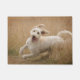Goldendoodle, bouche ouverte, oreilles clignotantes, court à travers l'herbe haute.