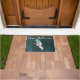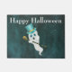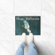 Ce tapis de porte d'accueil extérieur a un fantôme blanc habillé flottant dans un ciel étoilé plein de ciel, portant un chapeau bleu chic et tenant une canne noire et or avec un crâne doré. Customisez le texte Happy Halloween avec le modèle.