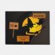 Un design graphique des sorcières d'Halloween avec le texte 'Bienvenue- la sorcière est dedans" sur un drôle de tapis de porte.