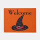 L'image est un casquette traditionnel aux sorcières noires avec des étoiles orange et une boucle argentée. Happy Samhain est écrit sur le bord du casquette. L'accueil est écrit sur le tapis. L'image est mon tableau original. Voir mon magasin Art by MAR pour apparier les produits avec ce design.