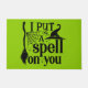 Ce design classique d'Halloween comporte l'expression éffrayante "Je mets un sort sur vous" dans une police audacieuse d'inspiration gothique. Les couleurs noir et blanc rehaussent l'atmosphère étrange, rendant le design parfait pour la saison d'Halloween. Le texte est accompagné d'éléments de sorcellerie iconiques, dont un casquette de sorcière pointu, un bâton de brosse, une toile d'araignée et une minuscule araignée, tous arrangés pour créer une composition de sorcière. Le détail subtil des points autour du texte ajoute une touche de charme magique.