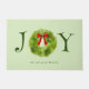 Tapis à thème de Noël vert rustique avec aquarelle illustration d'une couronne verte avec arc rouge. Le texte dit "JOY" dans une police festive. Ajoutez votre nom de famille en bas.