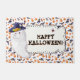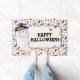 Tapis de porte festif Halloween avec un fantôme souriant portant un chapeau de sorcière et un message audacieux « Joyeux Halloween ! ». Entouré d'une bordure fantaisiste de citrouilles, de chauves-souris et de feuilles d'automne, ce design ludique fait un accent saisonnier amusant pour les porches, les entrées ou les espaces de fête. Une façon joyeuse d'accueillir les enfants qui font du porte-à-porte et les invités.