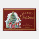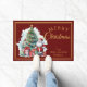 Un beau tapis de porte de Noël festif de la saison des Fêtes comprenant une illustration de dessin du Père Noël (père Noël) un sapin décoré et des cadeaux emballés. Texte couleur or et un arrière - plan rouge foncé. Tout le texte peut être modifié. Customisez le titre de joyeuses fêtes ou autre, puis personnalisez ce joli tapis de porte de Noël en ajoutant vos détails.