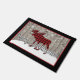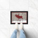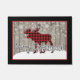 Ce tapis de Noël rustique de 18 po x 24 po a une bordure noire autour d'un arrière - plan en bois d'écorce taillé en rouge. Il présente une grande orignale rouge et noire de Buffalo posée debout sur des collines de neige avec des flocons de neige blancs qui tombent en arrière avec la pièce sur les mots de Joyeux Noël changés pour dire, "Joyeux Noël". Il est sûr de recevoir un coup de fouet de tous vos invités pendant les vacances.