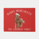Porte de Noël adorable avec un chien de caniche de Labradoodle portant un chapeau de santa sur un arrière - plan rouge festif.