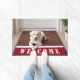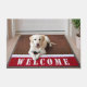 Blond Labrador Retriever chien sur un tapis rouge et brun avec texte de bienvenue à la porte d'entrée.