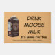 Une brique de lait de la ferme laitière Matanuska Moose Milk de renommée mondiale et entièrement mythique à Willow Alaska; pas trop loin d'Anchorage. Le slogan "Buvez du lait d'orignal, c'est bon pour vous" apparaît également. L'image du logo est ornée d'une milkmaid qui traite la Matilda, la première orignale laitière de la ferme. Croyez-le ou non, il y a des laiteries d'orignaux ; un petit nombre en Russie et un en Suède. Le lait d'orignal est cultivé commercialement en Russie. Un veau d'orignal né à la ferme est retiré de sa mère dans les 2-3 heures suivant la naissance et est élevé par des gens. Il est d'abord nourri en bouteille avec un substitut de lait, puis nourri à partir d'un seau. Les animaux s'impriment et deviennent attachés aux humains. Le lait est riche en matières grasses (10%) et solides (21,5%), selon les données recueillies sur l'orignal russe ; les recherches sur le lait d'orignal américain sont dans un état moins avancé qu'en Russie, mais semblent indiquer que les concentrations d'orignaux américains sont encore plus élevées dans leur lait. On dit que le lait d'orignal est un peu salé et amer, avec un soupçon d'aiguilles de pin ou d'épinette. Le lait d'orignal est cultivé commercialement en Russie. Un veau d'orignal né à la ferme est retiré de sa mère dans les 2-3 heures suivant la naissance et est élevé par des gens. Il est d'abord nourri en bouteille avec un substitut de lait, puis nourri à partir d'un seau. Les animaux s'impriment et deviennent attachés aux humains. Comme pour le bétail laitier, les veaux sont retirés de leur mère après un court laps de temps.Les Russes disent que l'orignal reconnait bientôt les sirènes de lait comme leur substitut comme ses veaux de remplacement. À ce stade, ils sont rejetés dans la forêt, mais ils visitent la ferme tous les jours pour être traités pendant la période de lactation (généralement, jusqu'à septembre ou octobre). En hiver, les animaux se promènent librement dans la forêt environnante. Mais en général, ils ne s'éloignent pas trop, mais passent une grande partie de leur temps dans les boisés voisins où les arbres sont coupés, se nourrissant des sous-produits de l'exploitation du bois. Et ils connaissent la ferme comme l'endroit pour une ration quotidienne de farine d'avoine, et comme un endroit sûr pour donner naissance à leurs jeunes. Un sanitorium russe sert du lait d'orignal aux résidents dans la conviction qu'il les aide à se remettre de la maladie ou à gérer les maladies chroniques plus efficacement. Des chercheurs russes ont recommandé que le lait d'orignal soit utilisé pour prévenir les maladies gastro-entérologiques chez les enfants. La ferme Elk (Oie sont appelés Elk in Europe) House (Älgens Hus) à Bjurholm, en Suède, est considéré comme le seul producteur mondial de fromage d'orignal. Le fromage se vend environ 500 dollars la livre. Le restaurant de l'Algens Hus sert des plats à base de fromage d'orignal. Fromage simple avec du pain ou des biscuits, ou mieux encore, mousse d'orignal congelé. Mieux servi avec des framboises.