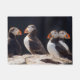 Photographie de 4 macareux regardant dans des directions opposées sur des roches des îles de Farne, le Northumberland.