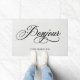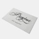 Cette natte rustique et élégante française indique le "bonjour" dans la calligraphie tourbillonnante et noire sur un arrière - plan gris et de toile de regard, et a une tache pour votre nom de famille.