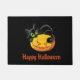 Tapis de porte avec un arrière - plan noir et un citrouille d'Halloween et imprimé de chat noir. Customisez ce tapis ou achetez tel quel.