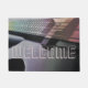 Natte moderne de paillasson de guitare basse. Une guitare basse électrique avec les lumières colorées chaudes se reflétant outre du cou. Le texte indique l'accueil, mais vous peut le changer en quelque chose que vous aimez ou partez en tant que lui. Une entrée merveilleuse à un ménage ou à un studio musical. Plus, elle fait un grand cadeau de pendaison de crémaillère pour votre bassiste, musicien ou mélomane préféré.