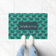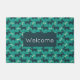 Un tapis de bienvenue conçu avec un motif répétitif avec un mignon chien souriant avec des oreilles disgracieuses et un os de chien. Arrière - plan vert.