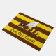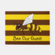 Visiteurs dedans avec cette natte d'abeille. Une abeille de bande dessinée est sur un fond jaune et brun de rayures. Le message lit la "abeille notre invité".
