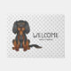 L'illustration originale de Destei d'un mignon chien de race Cavalier King Charles Spaniel de couleur noire et bronzée assis. Il y a aussi le texte qui dit maintenant "Bienvenue" avec une zone de texte personnalisable pour un nom de famille ou un autre texte personnalisé. L'arrière - plan a un motif d'empreintes de pattes gris.
