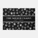 Tapis à thème animal qui présente un motif empreinte de patte de chiot élégant et lunatique avec des empreintes de pattes gris et blancs sur un arrière - plan noir. Nom de famille personnalisé et année établie présenté sur une bannière noire avec coordination des accents gris et blanc et du texte. Personnalisez avec le nom de famille personnalisé et la date d'établissement ou le message d'accueil personnalisé de votre choix, ou utilisez le bouton "concepteur de messages" pour obtenir de l'aide. Une porte personnalisée pour votre entrée pour accueillir vos invités, ou une maison moderne attentionnée pour les amoureux des animaux de compagnie dans votre vie ou pour toute occasion.