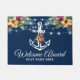 Porte de bateau personnalisée avec un arrière - plan bleu marine qui peut être changée en n'importe quelle couleur, une ancre nautique, de jolies fleurs tropicales d'été aquarelles, d'élégantes lampes à cordes, le texte "bienvenue à bord", et le nom des bateaux.