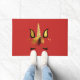 Un visage de licorne dorée avec de lourds cils noirs et des touches dorées sur l'arrière - plan rouge fait une "première impression" parfaite pour tous vos invités.