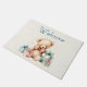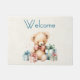 Un tapis de bienvenue avec une jolie illustration représentant un ours en peluche de style victorien. Portant un joli arc rouge. Dessiné dans un style vintage à l'ancienne et mignon. Des cadeaux de Noël pastel rouge et bleu entourent cet ours au coeur chaleureux.