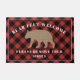 "Les pieds d'ours bienvenus Please Remove Shoes" texte blanc sur un arrière - plan en plaid rouge et noir avec silhouette d'ours inspirée des burlaps au centre.