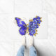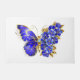Bijoux, bleu, saphir, papillon aux fleurs pétillantes avec aile décorée de bleu, fleurs précieuses avec feuilles d'or sur arrière - plan blanc.