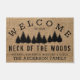 Bienvenue à vos invités dans votre maison avec ce tapis rustique, de campagne, de ferme qui contient les mots, "BIENVENUE À NOTRE COU DES BOIS, MICHAEL, ELIZABETH, BRAYDEN & ALEXA LA FAMILLE ANDERSON" en typographie noire avec pins sur un arrière - plan faux burlap. Personnalisez ce tapis en ajoutant vos propres informations personnelles sur votre famille. Un mariage parfait, un anniversaire, ou un cadeau de ménage. Cliquez sur "personnaliser ce modèle" pour changer les noms et les autres mots. Si vous avez besoin d'aide sur la personnalisation, envoyez-moi un courriel à ybnormalone @gmail.com. Merci de vous être arrêté par www.zazzle.com/WhisperingPines. ©Karen Hall