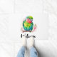 Un tapis de bienvenue avec une jolie illustration de perroquet. Un petit perroquet vert aux couleurs bleu et jaune se mélangeant. Le cou a une teinte vif de rose rougeâtre.