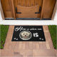 Photo Home Où Mon Chien Est Personnalisé Cute Custom Black Welcome Mat | Ce design mignon et inspirant présente la citation "Home is where my [your pet's face] is" dans la typographie moderne et tendance, flanquée d'empreintes noires, sur un arrière - plan noir. C'est un grand cadeau pour le propriétaire du chien qui aime son chien.