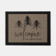 Parfait pour les vacances, l'hiver, ou votre maison ou cabine boisé, ce joli tapis de porte à thème de la forêt présente "bienvenue" dans un script de calligraphie manuscrit, avec un trio d'illustrations de pin esquissé à la main sur un arrière - plan taupe foncé. Personnalisez avec votre nom de famille.