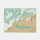 Tapis de porte d'entrée sur le thème de la plage fait dans de belles oeuvres d'art de l'eau mousseuse et une plage de sable, avec un coquillage. Personnalisez le texte vert mousse de mer pour lire ce que vous voulez. Quelle belle façon d'accueillir les invités dans votre maison.