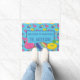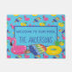 Bienvenue dans votre piscine ou chez vous avec ce tapis de porte amusant avec un motif de flotteurs de piscine aux couleurs vives ou des tubes de piscine en forme de flamant, un ananas et un popsicle contre un arrière - plan bleu vif. Utilisez le champ modèle pour ajouter facilement votre nom à ce matelas à thème du pool party.