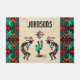 Personnalisez ce "One of a Kind" unique au sud-ouest de Kokopelli Doormat! Il comprend deux Kokopelli jouant de la Flûte et dansant autour d'un cactus sous le soleil sur un Arrière - plan de grès tan...Entouré d'une frontière sud-ouest en Turquoise, Orange et Noir!