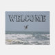 Un tapis de porte avec une photo d'un Mouette volant au-dessus de l'océan Atlantique portant un poisson dans sa bouche.