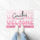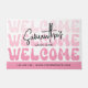 Tapis de porte d'accueil moderne avec polices rétro et arrière - plan rose dégradé. La police de caractères super indique "bienvenue" avec une police de script tendance en haut où vous pouvez écrire votre nom ou nom d'entreprise; il y a même de l'espace pour votre numéro de téléphone et votre site Web. Ce tapis de sol tendance apportera une touche de plaisir et de féminité à votre salon de coiffure, studio de maquillage, bar à cils, spa à ongles ou tout autre espace personnel ou d'affaires.