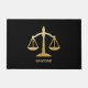 Un tapis de porte de bienvenue avec une image de balance dorée sur un arrière - plan noir. Simple et élégant.