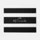 Bienvenue chez vous avec ce tapis de portes personnalisées à rayures blanches et noires. Il est conçu avec de larges bandes horizontales. Le centre est customisé avec le nom de famille en lettres manuscrites blanches et tendance. Cliquez sur l'option Personnaliser le modèle et entrez le nom.