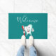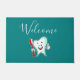 Tapis de bienvenue avec l'illustration d'une grande dent blanche de style dessin animé souriant joyeusement en tenant une brosse à dents rouge et en donnant le signe pouce vers le haut.