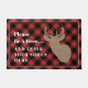 "S'il vous plaît, soyez un cerf.....Et laissez vos chaussures ici" texte blanc sur un arrière - plan en plaid rouge et noir avec une silhouette de cerf inspirée du burlap à droite.